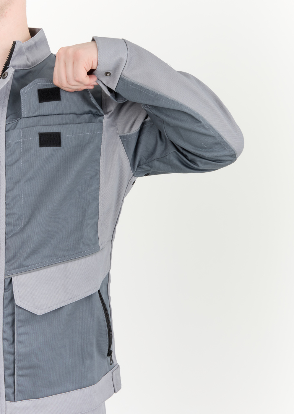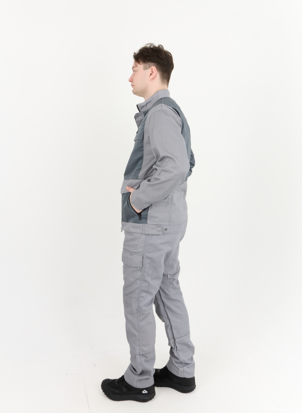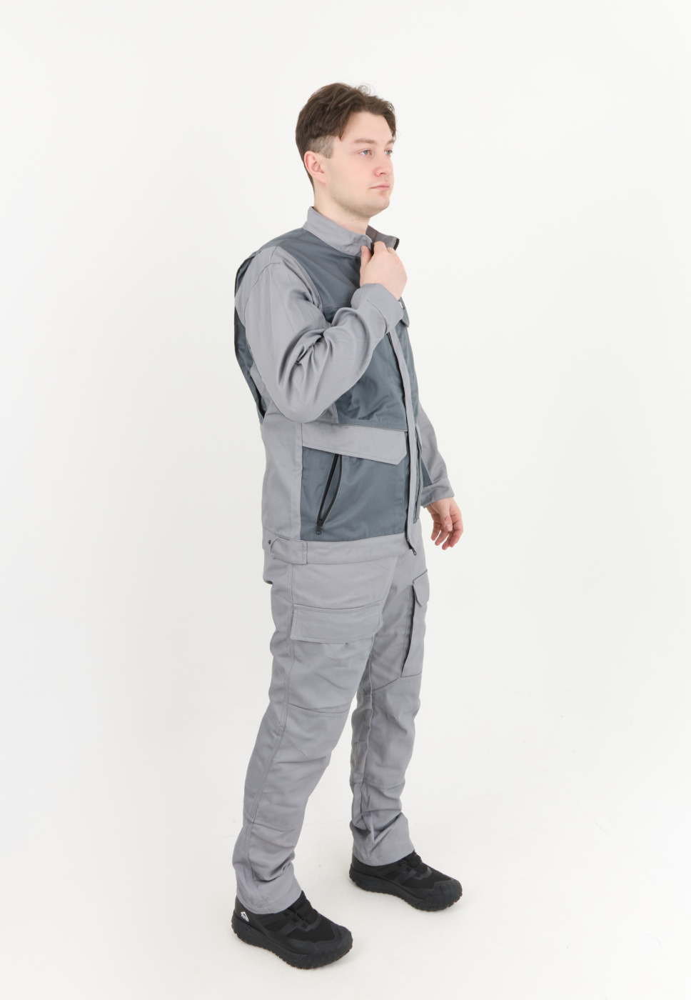 Рабочий комплект выполнен в сером цвете, что позволяет его легко сочетать с другими элементами рабочей одежды