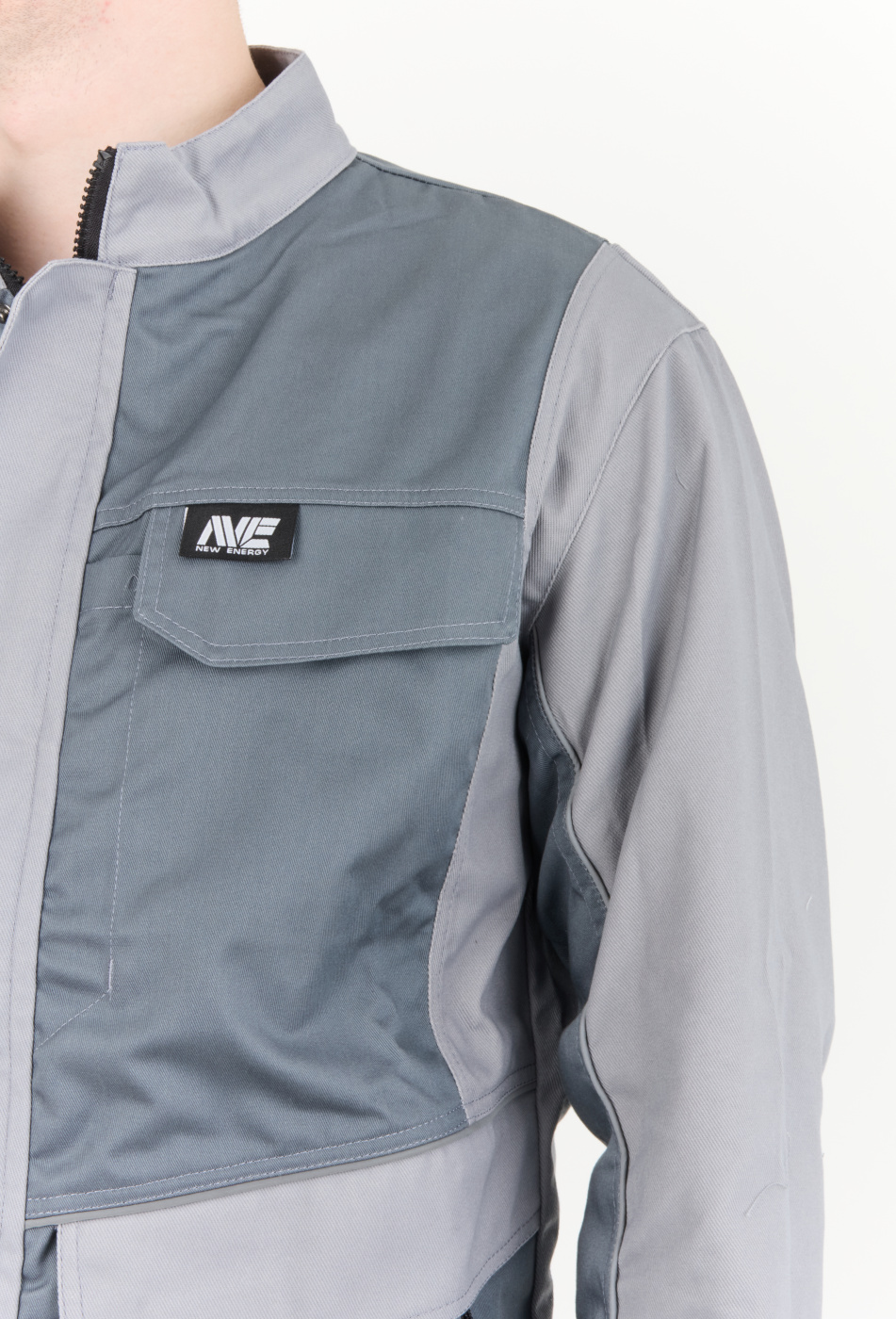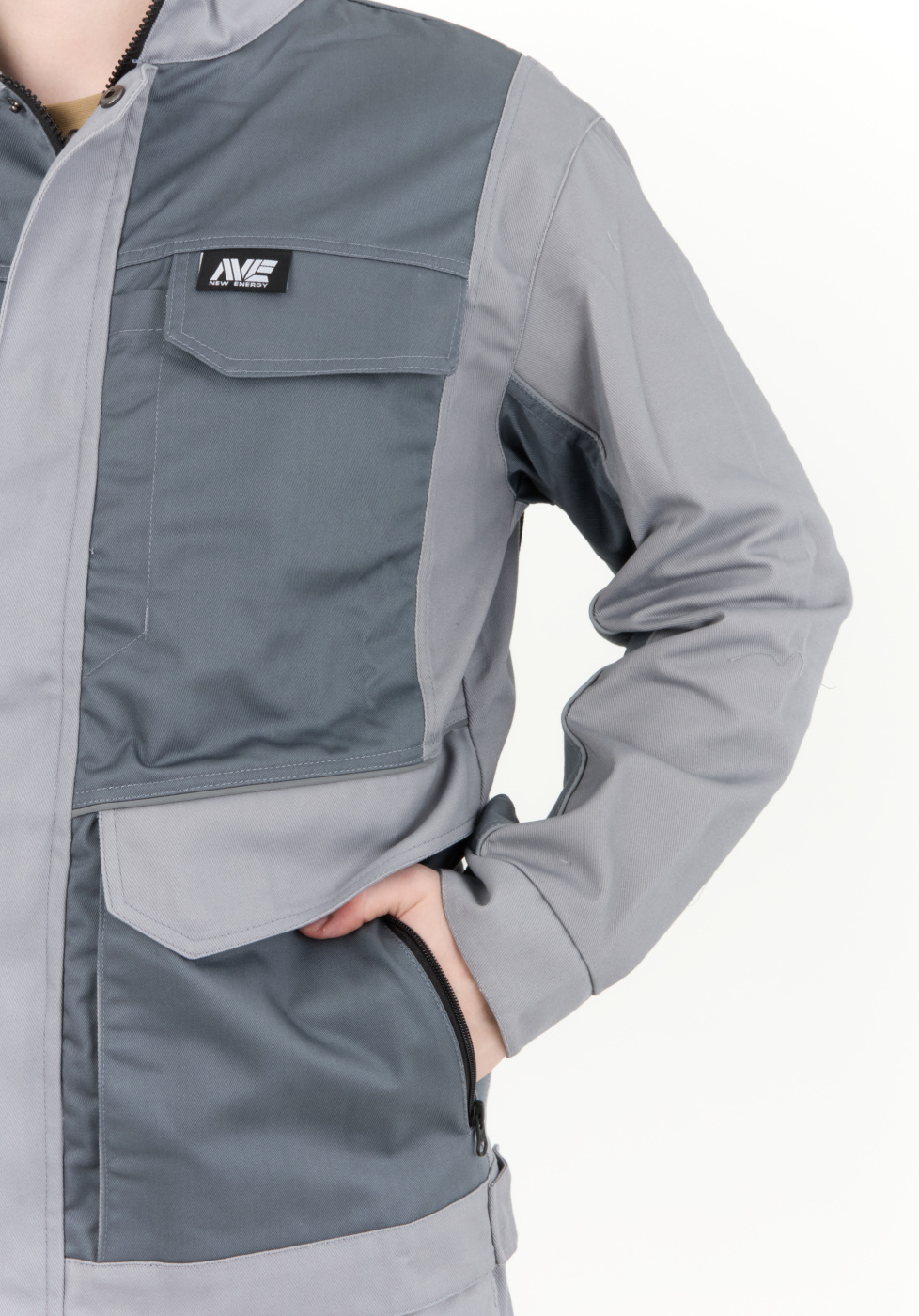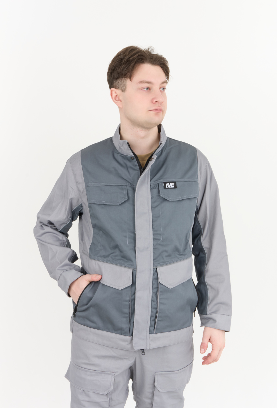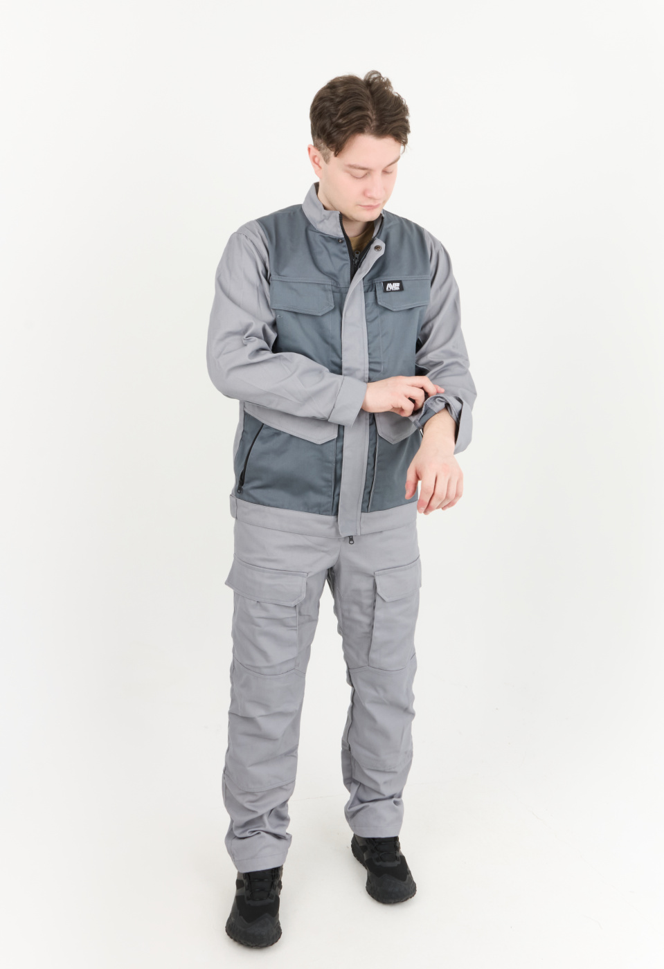 Рабочий комплект выполнен в сером цвете, что позволяет его легко сочетать с другими элементами рабочей одежды
